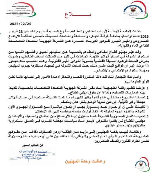 الاجتماع العاصف الذي عقده فرع الحسيمة للجامعة الوطنية لأرباب المقاهي والمطاعم لم يكن اجتماعاً روتينياً، بل كان أشبه بغرفة عمليات لتشريح جثة قطاع يحتضر. الشهادات التي استقيناها من قلب الحدث تؤكد أن الفواتير الأخيرة حملت مبالغ لا يمكن وصفها إلا بـ”الخيال العلمي”. هل يعقل أن تتضاعف الفاتورة بين عشية وضحاها في ظل ركود تجاري يشتكي منه القاصي والداني؟